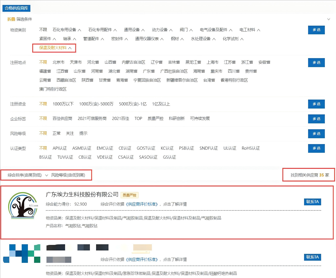 供应链工作委员会主要依托于石化行业供应商寻源平台(蓝蜜蜂平台)开展合格供应商、可信服务商评价工作。据查,在该平台合格供应商库中,埃力生研发能力、质量控制能力、生产能力及管理水平等方面综合得分92.90分,获得“质量严控”称号。截至发稿日,该平台“保温及耐火材料”35家合格供应商中,我司综合得分评价排名第一;全类别1191家合格供应商中,我司综合排名第十。